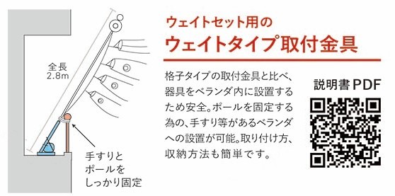 格子タイプの取り付け金具と比べ、器具をベランダン内に設置するため安全で、ポールを固定する為の、手すり等があるベランダへの設置が可能で、取り付け方、収納方法も簡単です。