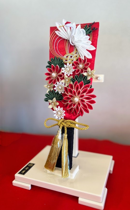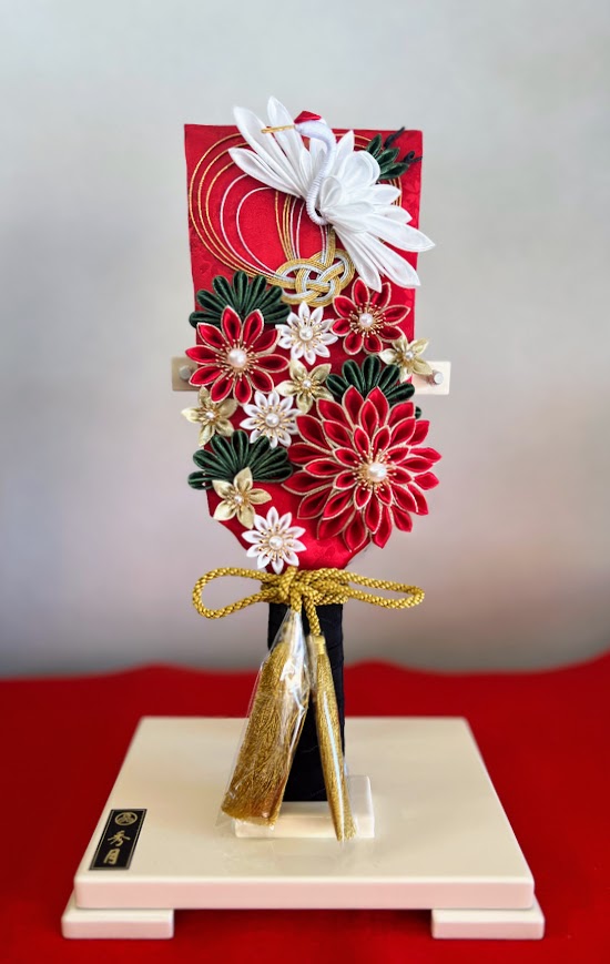 多方面で活躍するつまみ細工作家、咲良さんの羽子板飾りが完成いたしました。