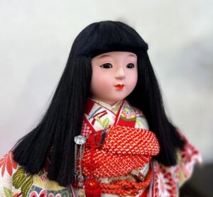 一部の番組やSNS等で、市松人形を怖い扱いをする者がいますので若い子達からしても、市松人形=怖いというイメージが付いてしまっていますが、もう25年以上秀月ではこうしたパーマの髪型にしたり、髪飾りと付けたりしながら、もちろん昔ながらの市松人形も居ますが可愛らしく仕上げております。
