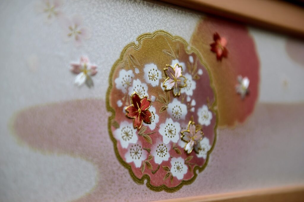 そして、お飾り台正面には屏風と同じ日本の伝統の吉祥紋である雪輪を配し、同じ様に桜の刺繍と絵で全体の統一感を持たせ、可愛らしくも上品に仕上げられております。