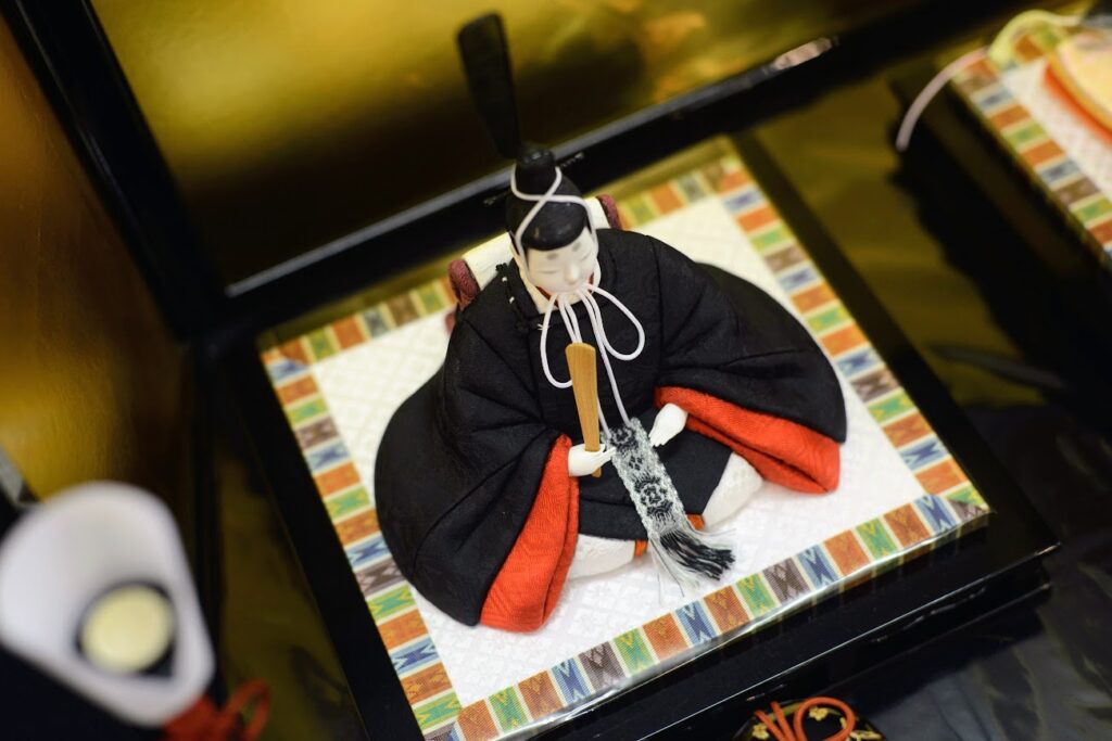 同じ黒でも深みのある漆黒の様な美しい黒に、お袖の目の覚める様な美しい赤がハッキリとした色合いで男雛を格調高くします。