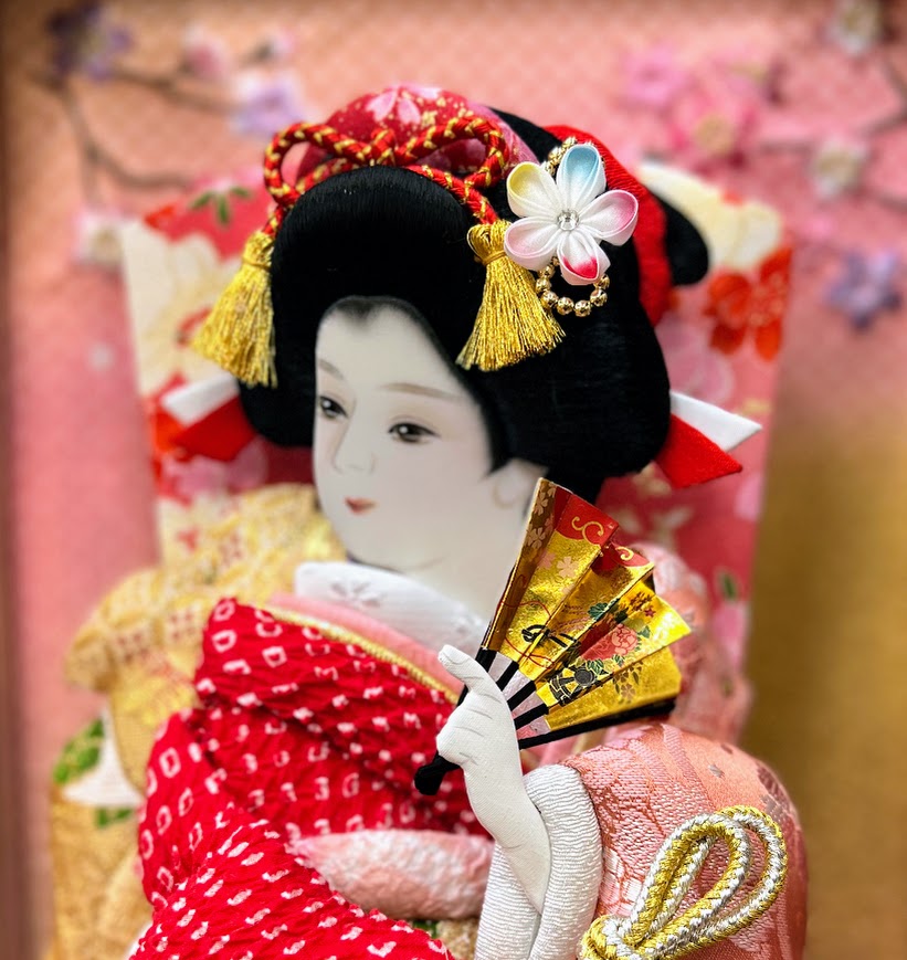 お選びいただいいた羽子板は、昔ながらの伝統的な手作りの押絵羽子板で、赤とピンクのお袖を用いた可愛らしくも美しい羽子板飾り。