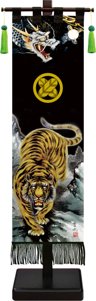 黒地に映える金色のお名前が豪華で、図柄も立身出世の「龍」と陸上の王者「虎」が一対となる事により、力強さと躍動感を表すとともに、神獣として吉兆を願う心を表現した最高級の逸品です。