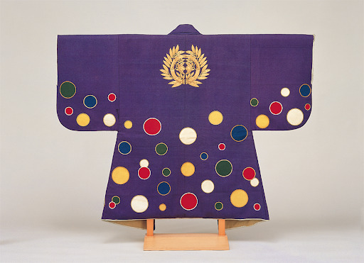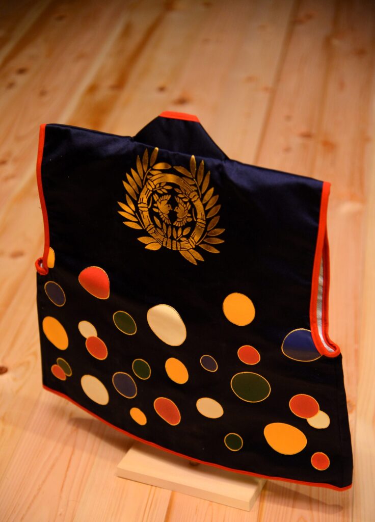 こちらが現在も残る江戸時代中期の作で、紫色の地に、五色の丸い模様を配した斬新で華やかな意匠の陣羽織で、背には「竹に雀紋」が金糸で刺繍されています。