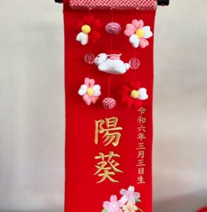 名前旗というと秀月では秀月オリジナル お名前立札(木札) オルゴール付を筆頭に宮内庁御用達漆器店制作 蒔絵 名前旗 桃の節句やオリジナル高級押絵刺繍名前旗飾り『梅ごよみ』などがございますが、こちらは厳選した可愛らしい桜のリースが刺繍された名前旗。