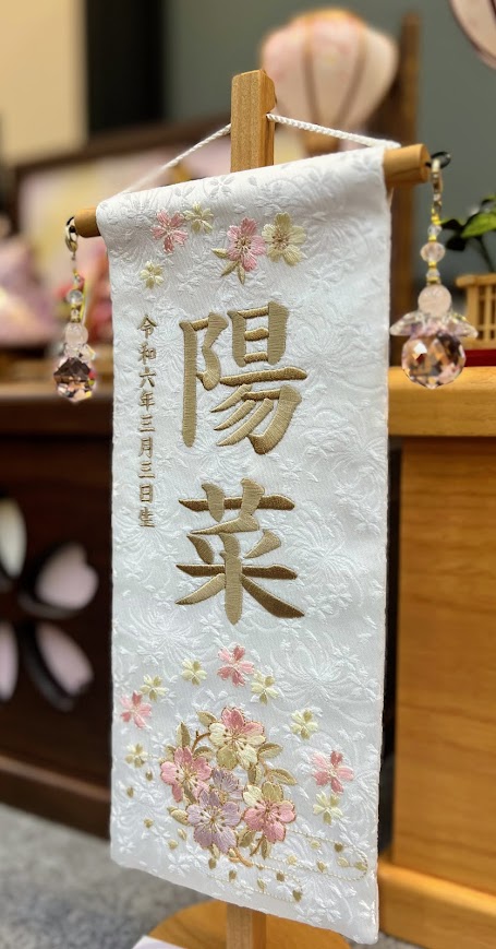名前旗というと秀月では秀月オリジナル お名前立札(木札) オルゴール付を筆頭に宮内庁御用達漆器店制作 蒔絵 名前旗 桃の節句オリジナル高級押絵刺繍名前旗飾り『梅ごよみ』などがございますが、こちらは厳選した可愛らしい桜のリースが刺繍された名前旗。
