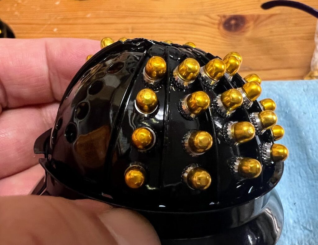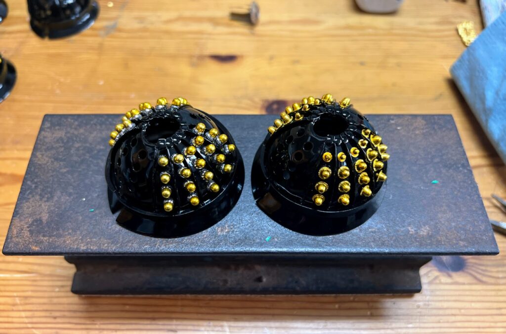 兜にもよりますが、写真の兜の場合、星だけで単純に40個植え、さらに前後に方白(ほうじろ)という金具や篠垂れ(しのだれ)とう金具や、頂点には八万座(はちまんざ)という金具を付けていきますので、この兜鉢だけでも膨大な仕事量となる訳です。