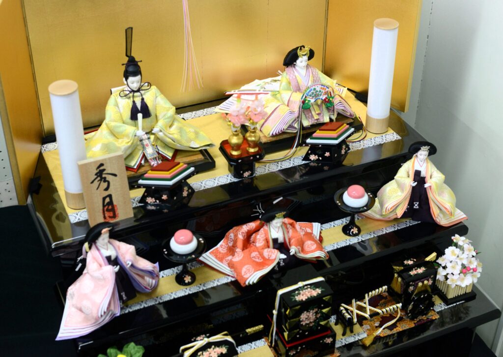 秀月オリジナルの現代風に可愛らしいパステルな三段飾りのお雛様。