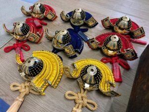 こうして完成した『飛龍兜』ですが、どの様なお飾りとして仕上げようかと、台や屏風・弓太刀等を合わせてはやり直しとやっております。